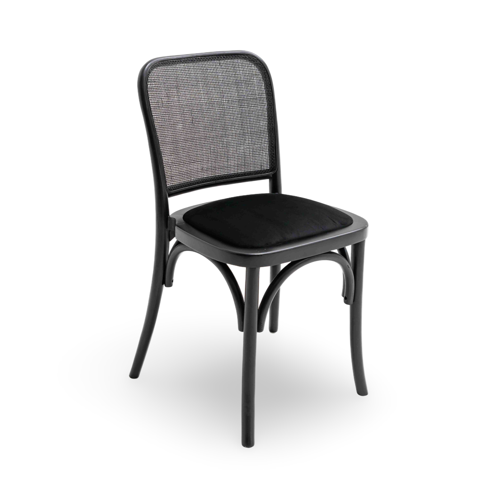 Black Rattan backing with a black velvet seat pad.